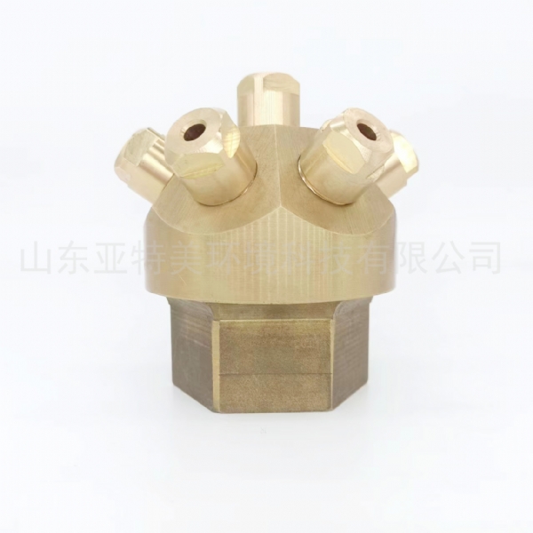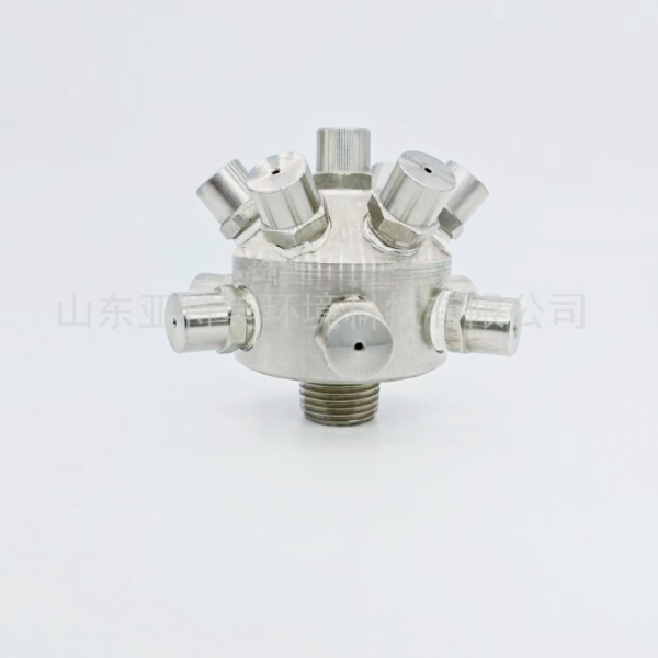 山东亚特美多头雾化喷头(清洗喷头),流量较大,这种喷嘴固定安装在槽罐的中央,每个喷头上装有7个实心锥喷嘴,可以全面覆盖槽罐的内部。山东亚特美多头雾化喷头(清洗喷头),有两种连接尺寸,一种为 1-1/2英寸,另一种为3英寸.1-1/2英寸的喷头的清洗直径为4.5 米,3英寸的喷头的清洗直径为 6.7 米。